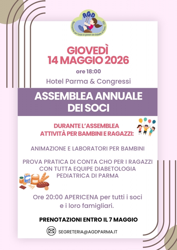 Avrà luogo giovedì 14 Maggio alle ore 18,00 presso l’HOTEL PARMA E CONGRESSI l’ASSEMBLEA ANNUALE dei SOCI AGD PARMA ODV con il seguente dOrdine ODG:
