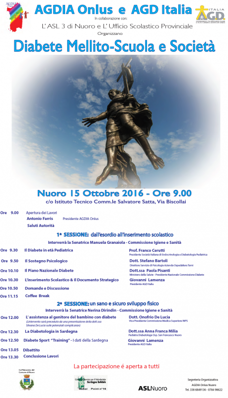 AGDIA di Nuoro e AGD Italia sono lieti di invitarvi al Convegno. “ Diabete Mellito-Scuola e Società” che si svolgerà a NUORO il 15 Ottobre 2016 - Ore 9.00 c/o Istituto Tecnico Comm.le Salvatore Satta, Via Biscollai organizzato in collaborazione con l’ASL 3 di Nuoro e l’ Ufficio Scolastico Provinciale.