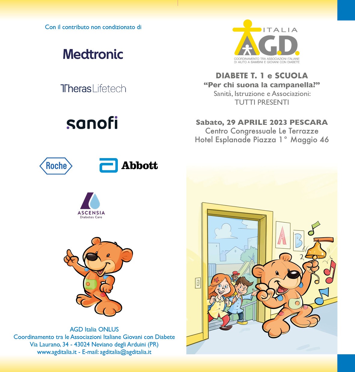 " DIABETE T. 1 e SCUOLA “Per chi suona la campanella?” Sanità, Istruzione e Associazioni: TUTTI PRESENTI è il titolo del Convegno organizzato da AGD ITALIA per SABATO 29 Aprile a PESCARA presso il Centro Congressuale Le Terrazze.