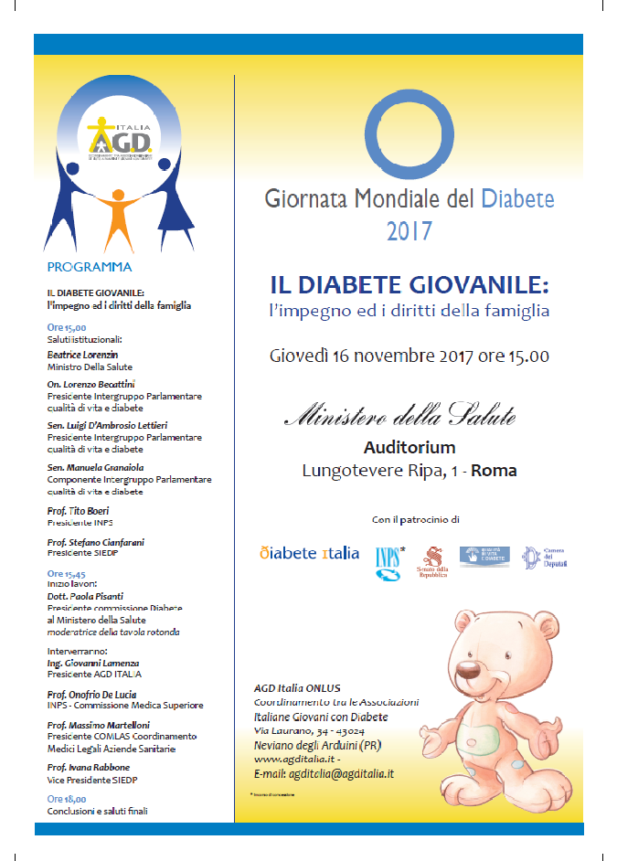 “Il diabete giovanile: L’impegno e i diritti della famiglia” è il titolo del Convegno organizzato da AGD ITALIA giovedì 16 Novembre alle ore 15:00 presso l’Auditorium del Ministero della Salute a Roma, Lungotevere Ripa 1.