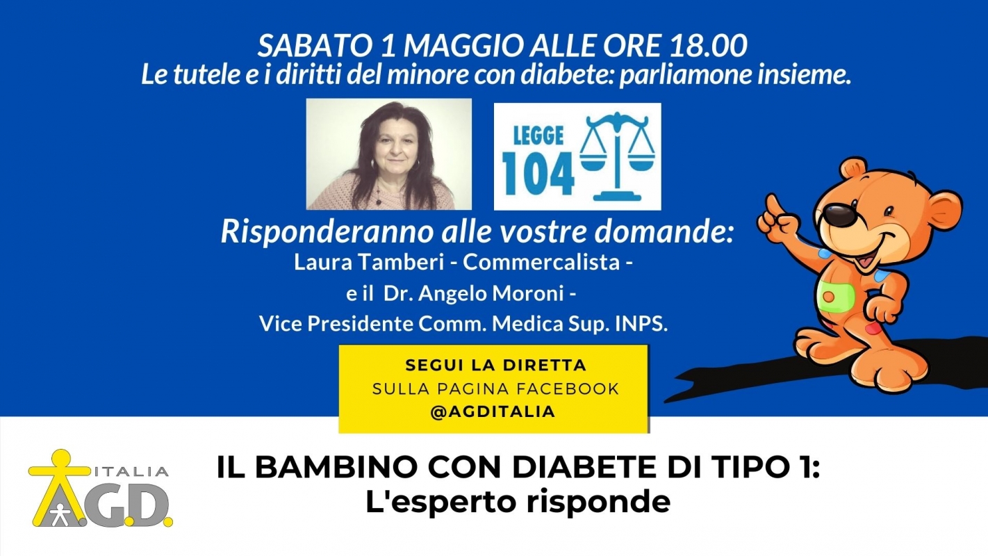 SABATO 1 MAGGIO alle ore 18,00 “Le tutele e i diritti del minore con diabete: parliamone insieme” in diretta sulla nostra pagina Facebook il secondo appuntamento della nuova rubrica di AGD ITALIA “IL BAMBINO CON DIABETE di TIPO 1: L’ESPERTO RISPONDE.