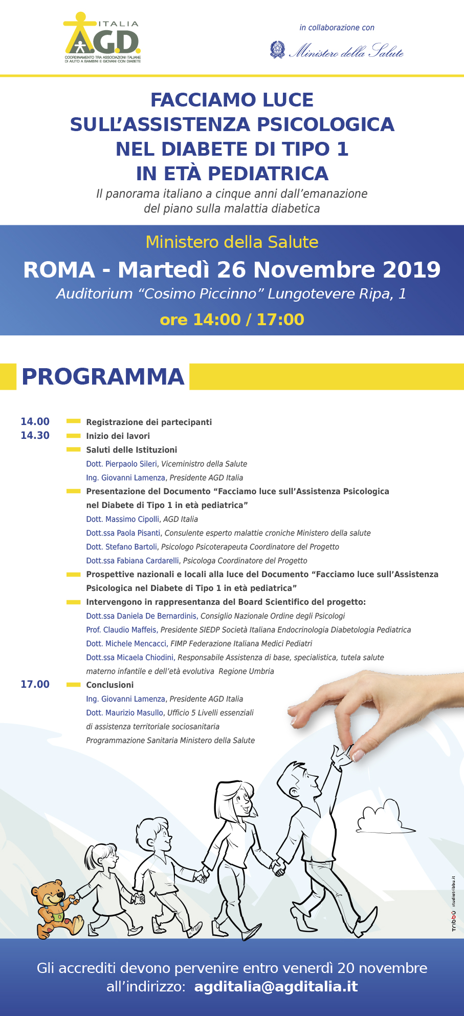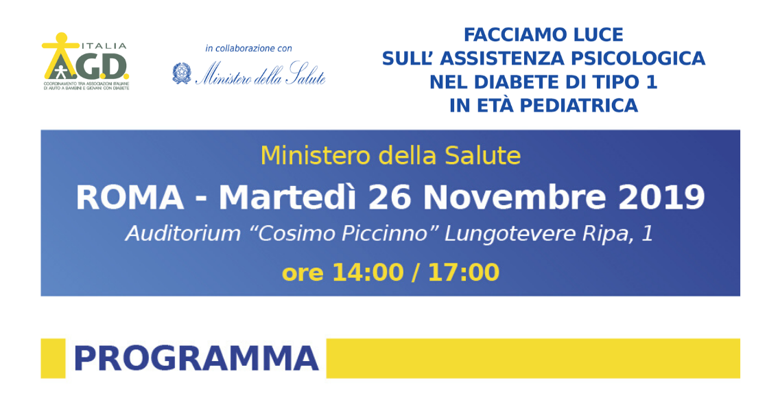 Il 26 novembre p.v. presso l’Auditorium del Ministero della Salute, in accordo con la segreteria del Ministro Dr. Roberto Speranza, ci sarà la presentazione de Documento "Facciamo Luce sull'Assistenza Psicologica nel Diabete di Tipo 1 in età pediatrica" frutto del lavoro e dell’esperienza di diverse professionalità coinvolte nel percorso di cura dei nostri ragazzi.
