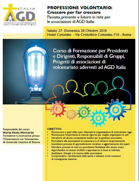 Per questo motivo AGD ITALIA organizza nelle giornate di Sabato 27- Domenica 28 Ottobre 2018 a Roma, sala Convegni dell’ Hotel Colombo il Corso di Formazione per Presidenti e Dirigenti, Responsabili di Gruppi, Progetti per le associazioni di volontariato affiliate.