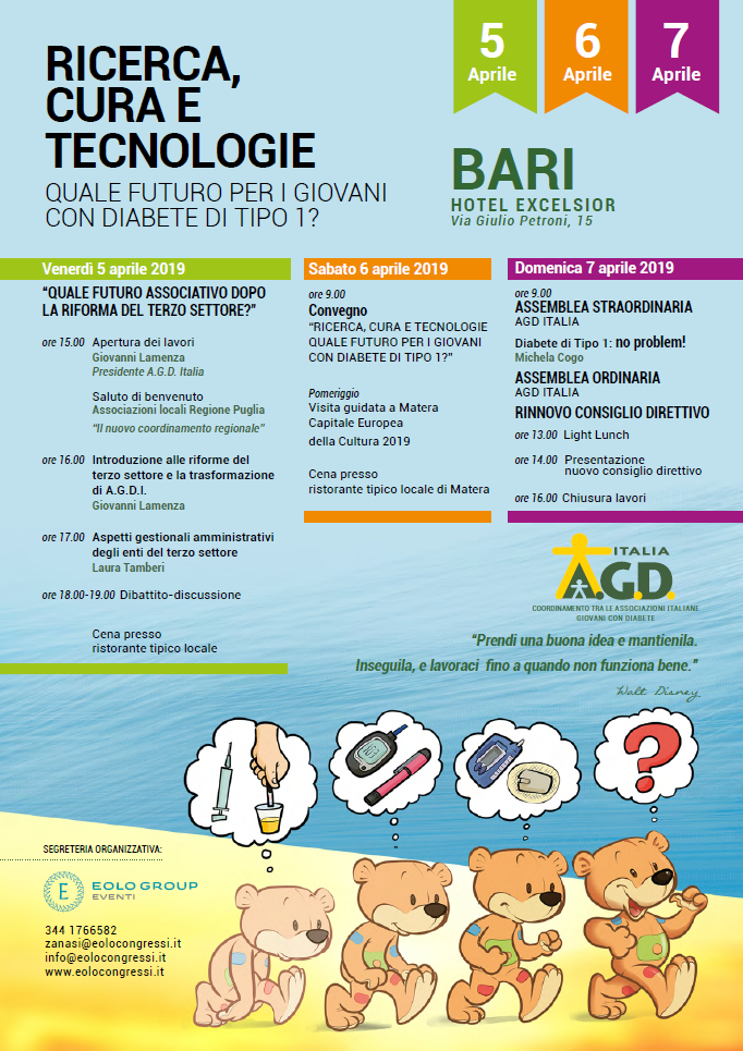 SABATO 6 APRILE con inizio alle ore 8,30 presso l’Hotel Excelsior, via Giulio Petroni, 15. avra luogo il Convegno “ Ricerca, cura e tecnologie. Quale futuro per i giovani con diabete di T. 1?