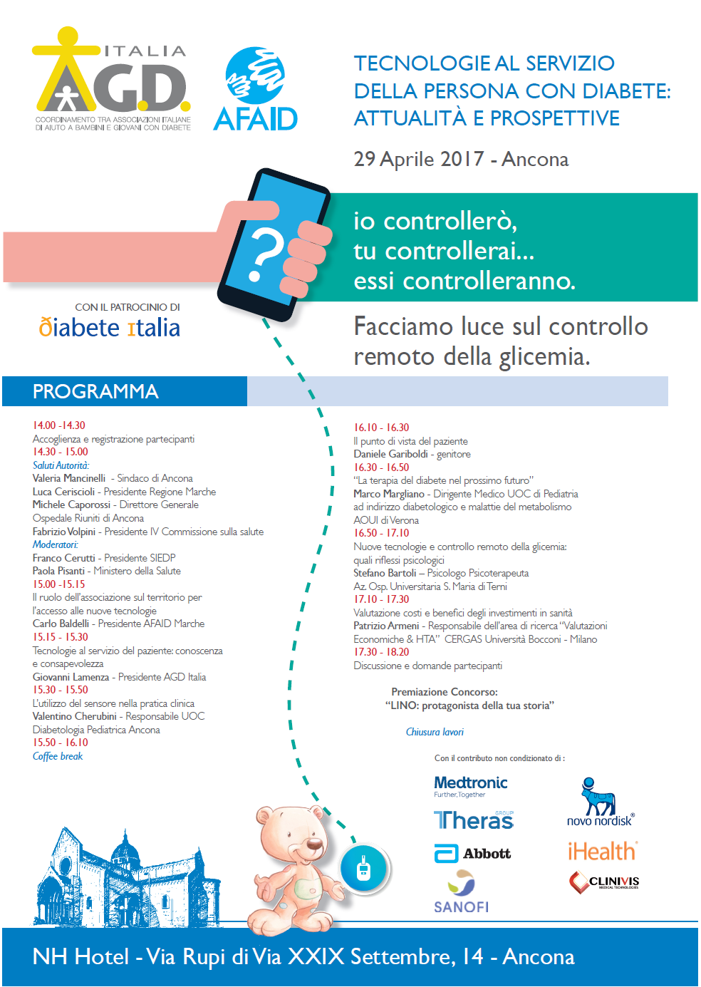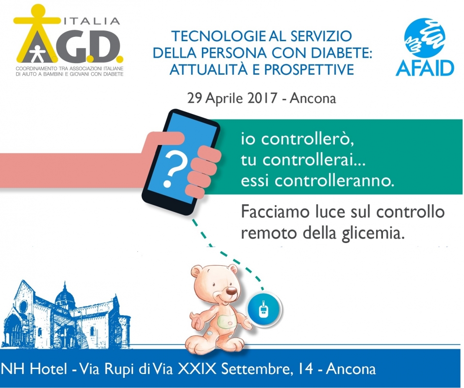 TECNOLOGIE AL SERVIZIO DELLE PERSONE CON DIABETE: ATTUALITA’ e PROSPETTIVE - FACCIAMO LUCE SUL CONTROLLO REMOTO DELLA GLICEMIA è il titolo del Convegno organizzato da AGD ITALIA in collaborazione con AFAID Marche che si svolgerà ad Ancona SABATO 29 APRILE alle ore 14,30 presso il NH HOTEL via Rupi di Via XXIX Settembre n. 14.