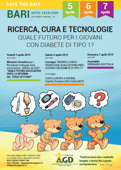 Sabato 6 Aprile avrà luogo il Convegno “RICERCA, CURA E TECNOLOGIE - Quale futuro per i giovani con diabete di Tipo1?” a cui farà seguito una visita guidata alla città di Matera - Capitale Europea della Cultura 2019, eventi che precederanno la consueta Assemblea Istituzionale Annuale che si terrà domenica 7 Aprile alle ore 9.00.